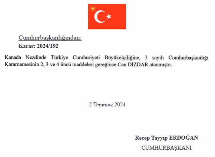 Cumhurbaşkanı Erdoğan imzasıyla yayımlanan kararlara göre Kanada Nezdinde Türkiye Cumhuriyeti Büyükelçiliğine, 3 sayılı Cumhurbaşkanlığı Kararnamesinin 2, 3 ve 4’üncü maddeleri gereğince Can Dizdar’ın atandığı duyuruldu.