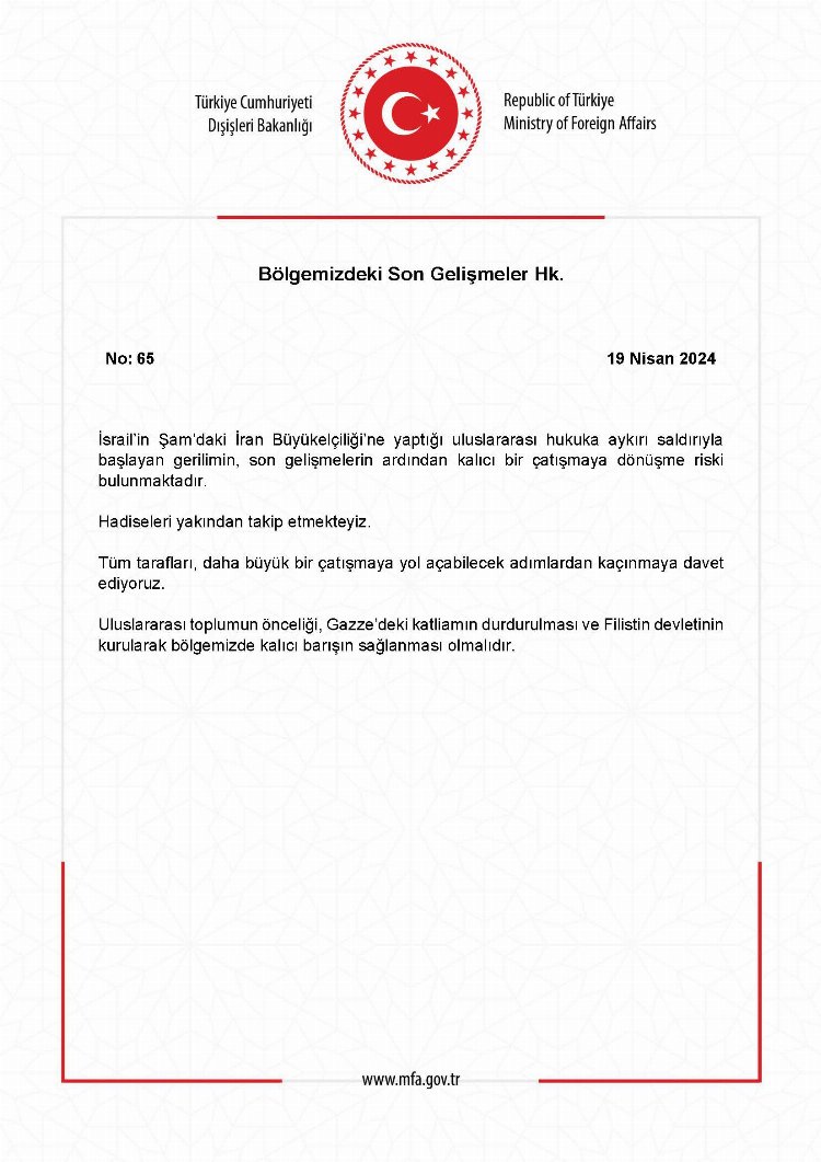 ANKARA (İGFA) – Dışişleri Bakanlığı’ndan yapılan açıklamada “İsrail’in Şam’daki İran Büyükelçiliği’ne yaptığı uluslararası hukuka aykırı saldırıyla başlayan gerilimin, son gelişmelerin ardından kalıcı bir çatışmaya dönüşme riski bulunduğu kaydedildi.
