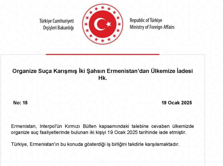 Bakanlık, organize suça karışmış 2 kişinin, Ermenistan’dan Türkiye’ye iadesine ilişkin yaptığı yazılı açıklamada, Ermenistan’ın, Uluslararası Polis Teşkilatının (Interpol) kırmızı bülten kapsamındaki talebine cevaben, organize suç faaliyetlerinde bulunan 2 kişiyi Türkiye’ye iade ettiğini anımsatarak, Ermenistan’ın bu konuda gösterdiği işbirliğini takdirle karşıladığını ifade etti.