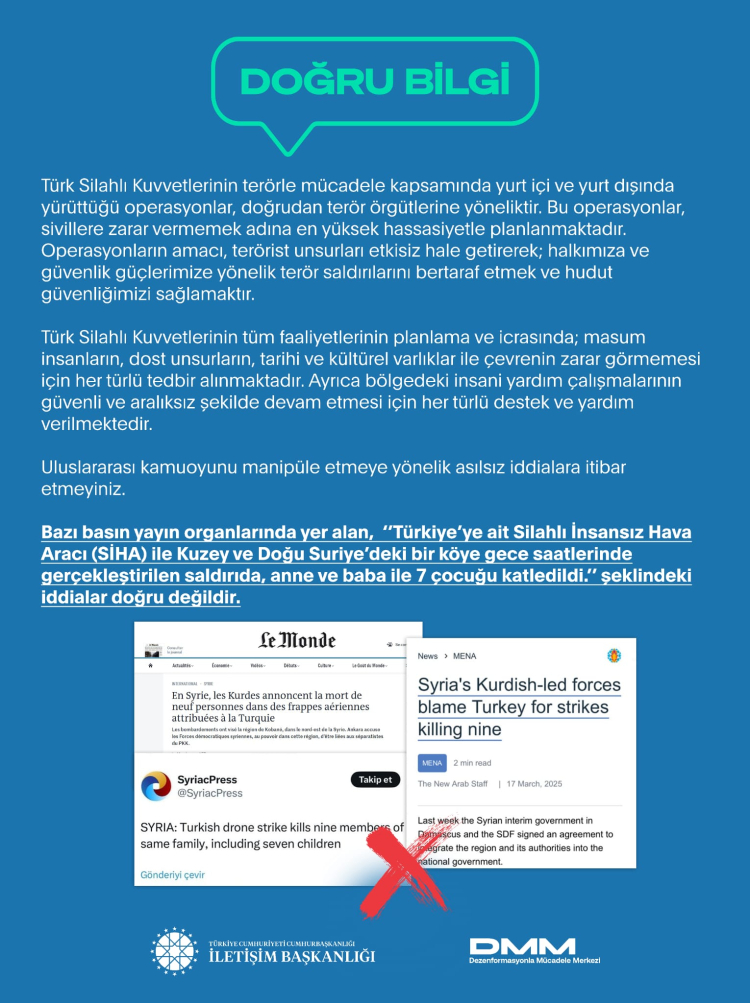 Bazı basın yayın organlarında yer alan, “Türkiye’ye ait Silahlı İnsansız Hava Aracı (SİHA) ile Kuzey ve Doğu Suriye’deki bir köye gece saatlerinde gerçekleştirilen saldırıda, anne ve baba ile 7 çocuğu katledildi.’’ şeklindeki iddiaların gerçeği yansıtmadığı açıklandı.