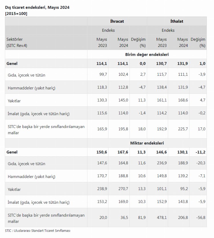 TÜİK’in Dış Ticaret Endeksi verilerine göre, bir önceki yılın aynı ayına göre gıda, içecek ve tütünde yüzde 2,7 ve yakıtlarda yüzde 11,3 artarken, ham maddelerde (yakıt hariç) yüzde 4,7, imalat sanayinde (gıda, içecek, tütün hariç) yüzde 1,4 azaldı.