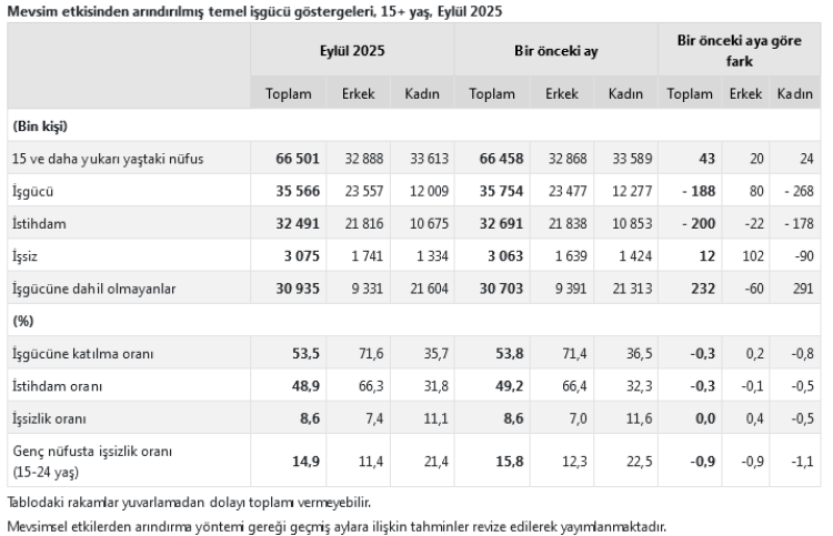 TÜİK’in Hanehalkı İşgücü Araştırması sonuçlarına göre, Eylül 2025’te Türkiye’de mevsim