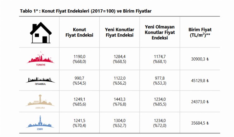 Buna göre üç büyük il için endeks değişiminde bir önceki aya göre İstanbul, Ankara ve İzmir’de sırasıyla yüzde 1,3, 2,4 ve 2,8 artış görüldü.