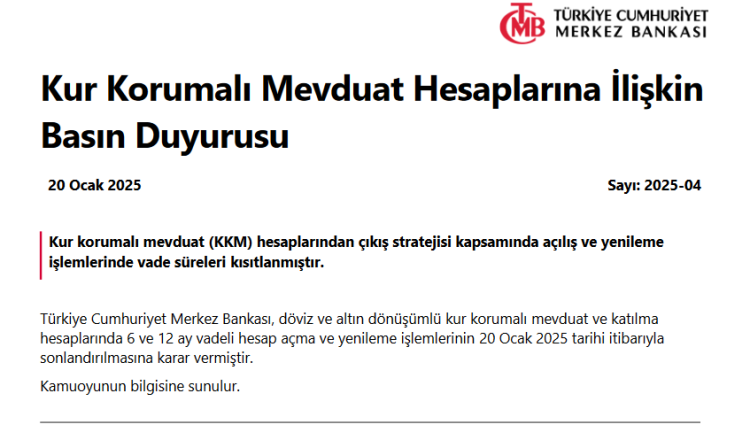 Bankadan yapılan duyuruda, “Türkiye Cumhuriyet Merkez Bankası, döviz ve altın dönüşümlü kur korumalı mevduat ve katılma hesaplarında 6 ve 12 ay vadeli hesap açma ve yenileme işlemlerinin 20 Ocak 2025 tarihi itibarıyla sonlandırılmasına karar vermiştir” ifadeleri yer aldı.