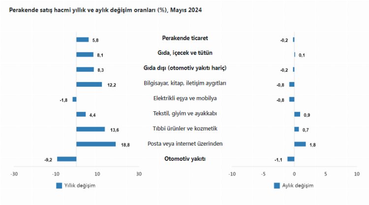 Buna göre Ticaret Satış Hacim Endeksi, 2024 yılı Mayıs ayında bir önceki yılın aynı ayına göre yüzde 3,8 azaldı. Aynı ayda motorlu kara taşıtlarının ve motosikletlerin toptan ve perakende ticareti ile onarımı için satış hacmi ,0 azaldı, toptan ticaret satış hacmi yüzde 4,6 azaldı, perakende ticaret satış hacmi ise yüzde 5,8 arttı.