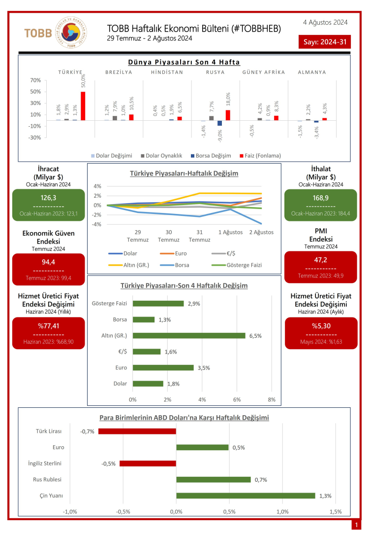 Türkiye ve dünya ekonomisinde yaşanan güncel gelişmelerin yer aldığı TOBB Haftalık Ekonomi Bülteni’nde 29 Temmuz – 2 Ağustos tarihleri arasındaki yaşanan güncel gelişmeler değerlendirildi.
