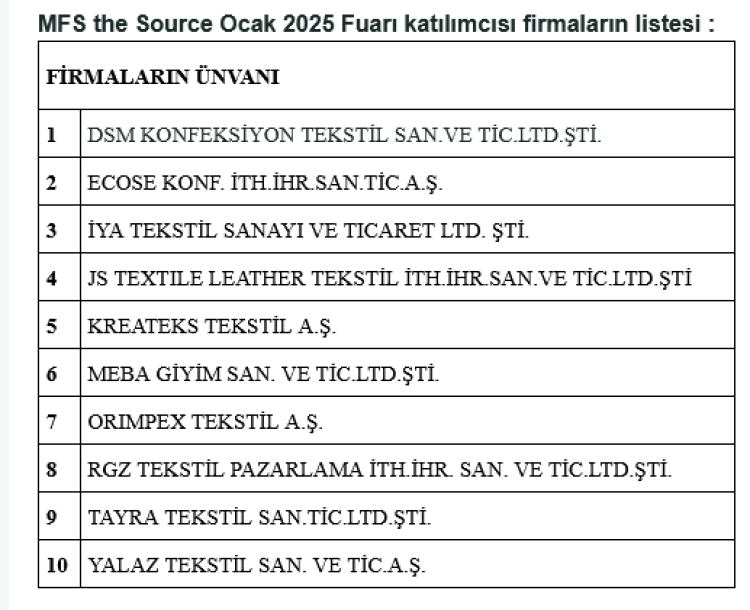 Ege Hazırgiyim ve Konfeksiyon İhracatçıları Birliği Başkanı Burak Sertbaş, 2024 yılında sektörün yaşadığı sıkıntıların 2025’in ilk çeyreğinde de sürmesini beklediklerini, müşteri bulmanın en etkin yolunun fuarlardan geçtiğini, Almanya’nın en büyük hazırgiyim ihraç pazarımız olduğunu belirterek, MFS the Source fuarına EHKİB olarak düzenli katılım sağlanmasının önemli olduğunu, firmalarımızın 2.holde bulunan “The Source” alanında 2 gün boyunca ilkbahar-yaz 2026 koleksiyonlarını sergileyeceğini belirtti.