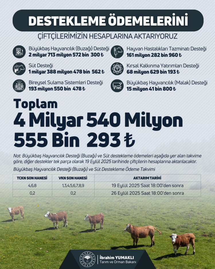Tarım ve Orman Bakanı İbrahim Yumaklı, sürdürülebilir üretim için çiftçilere toplam 4 milyar 540 milyon 555 bin 293 lira tutarında tarımsal destek ödemesinin bugün hesaplara aktarılmaya başlandığını duyurdu.