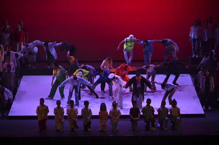 İçişleri Bakanlığı’nın 15 Temmuz filmi gösterildi. Erdoğan’ın konuşması sırasında 16 Türk devletini temsil eden askerler ve bayraklar yer aldı.