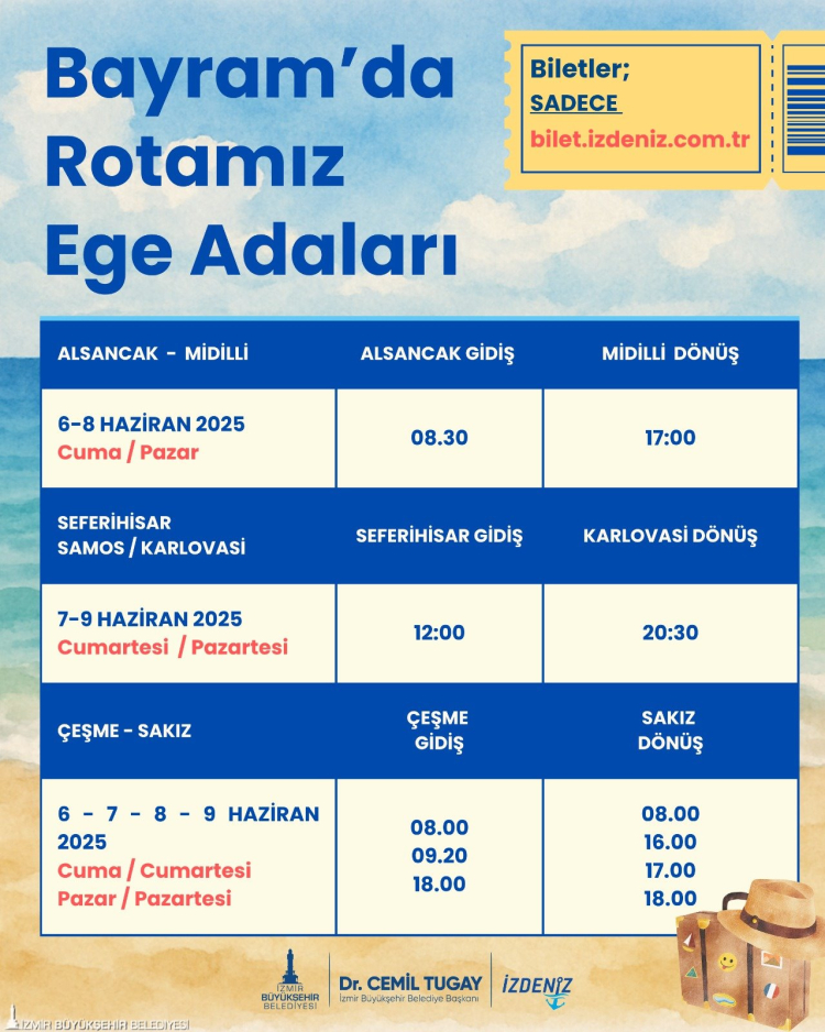 Öte yandan 2025 yaz sezonu boyunca ROTAMIZ EGE ADALARI sloganı ile üç uluslararası hatta sefer yapan İZDENİZ AŞ, Kurban Bayramı’nda da Midilli, Sakız ve Samos adalarına özel sefer düzenliyor. İzmir Alsancak Limanı – Midilli, Çeşme Limanı – Sakız ve Seferihisar Marina – Samos / Karlovasi seferleriyle vatandaşlara tatil imkanı sunuluyor. Alsancak Limanı – Midilli seferi 6 Haziran Cuma gidiş, 8 Haziran Pazar dönüş olacak. Seferihisar Marina – Samos seferi, 7 Haziran Cumartesi gidiş, 9 Haziran Pazartesi dönüş olacak şekilde düzenlendi.