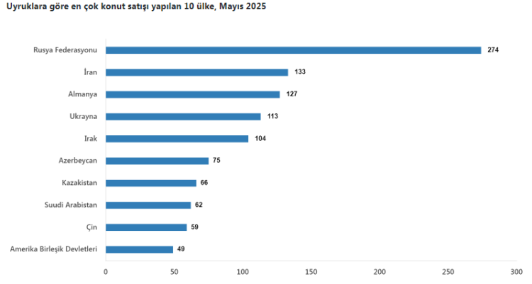 Ocak-Mayıs döneminde ise yüzde 13,7 düşüşle 7 bin 789’a indi. En çok satış yapılan iller İstanbul (648), Antalya (594) ve Mersin (145) oldu. Rusya Federasyonu vatandaşları 274 satışla ilk sırada yer alırken, İran (133) ve Almanya (127) takip etti.