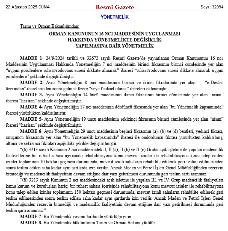 Söz konusu yönetmelikle madencilik faaliyetleri ve orman alanlarının kullanımıyla ilgili önemli düzenlemeler getirildi.