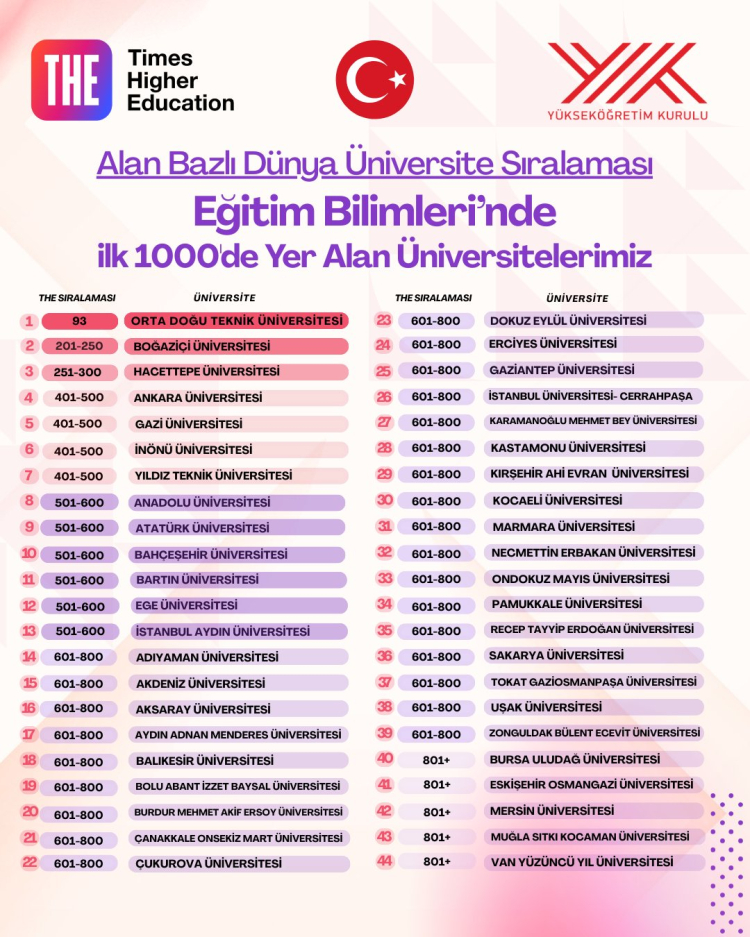 Eğitim Bilimleri alanında dünyanın en iyi 100 üniversitesi arasına giren Orta Doğu Teknik Üniversitesi’nin (93. sıra) özel bir başarıya imza attığını vurgulayan Özvar, Boğaziçi Üniversitesi (201–250), Hacettepe Üniversitesi (251–300) ile Ankara, Gazi, İnönü ve Yıldız Teknik Üniversitelerinin (401–500) elde ettiği derecelerin de son derece kıymetli olduğunu kaydetti.