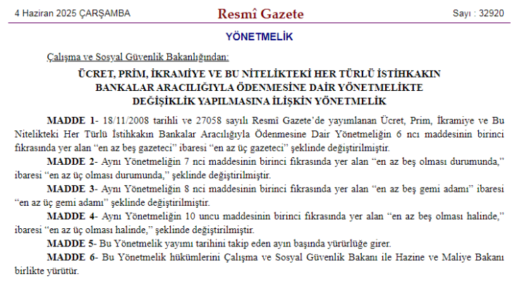 Çalışma ve Sosyal Güvenlik Bakanlığı, ücret, prim, ikramiye ve benzeri ödemelerin bankalar aracılığıyla yapılmasına dair yönetmelikte değişiklik yaptı. İşçi, gazeteci ve gemi adamı sayısında “en az 5” şartı “en az 3” olarak düşürüldü. Yeni düzenleme, 1 Temmuz 2025’te yürürlüğe girecek.